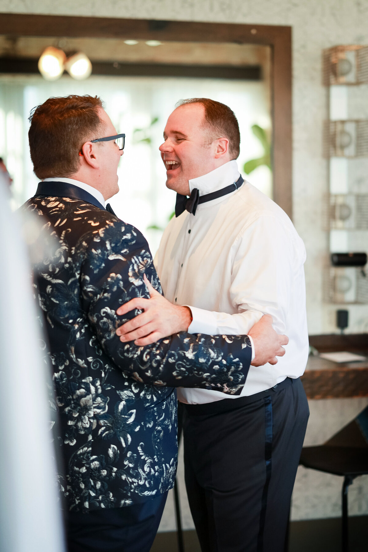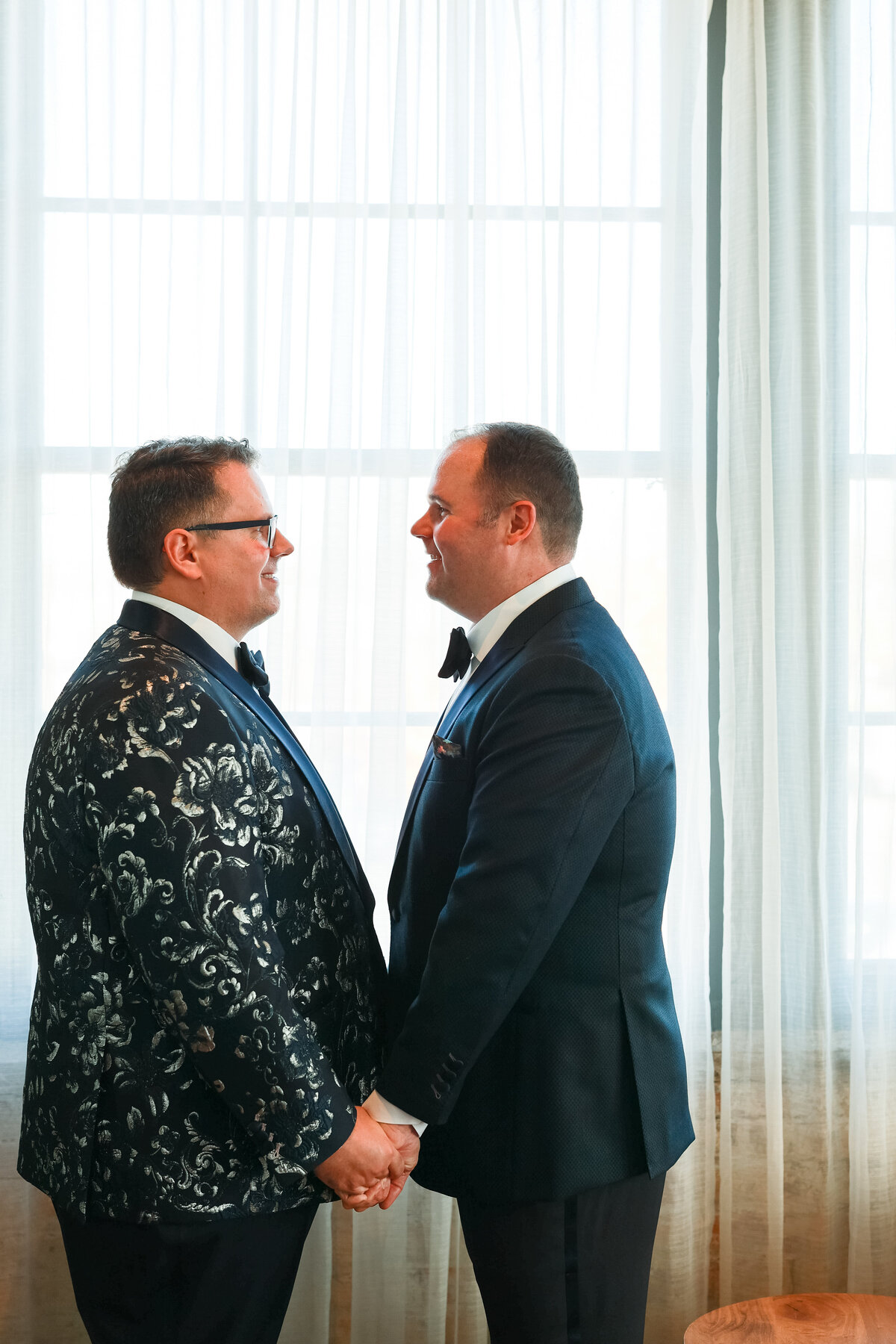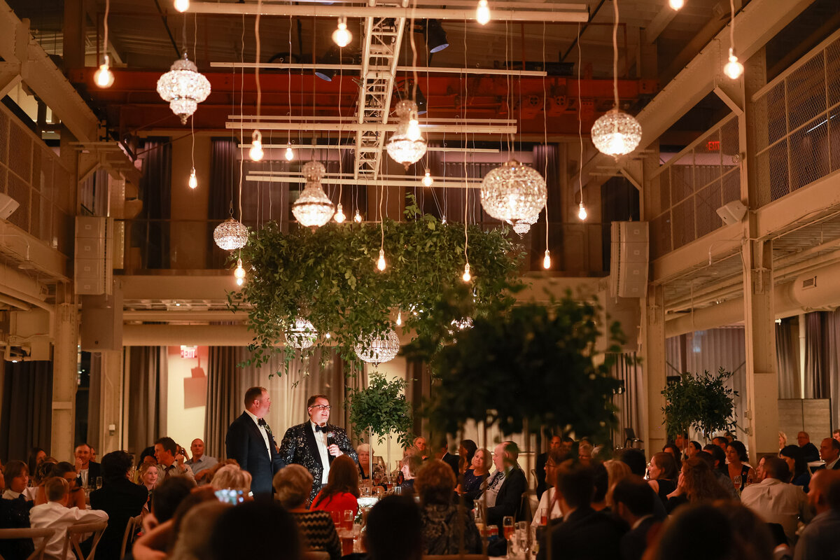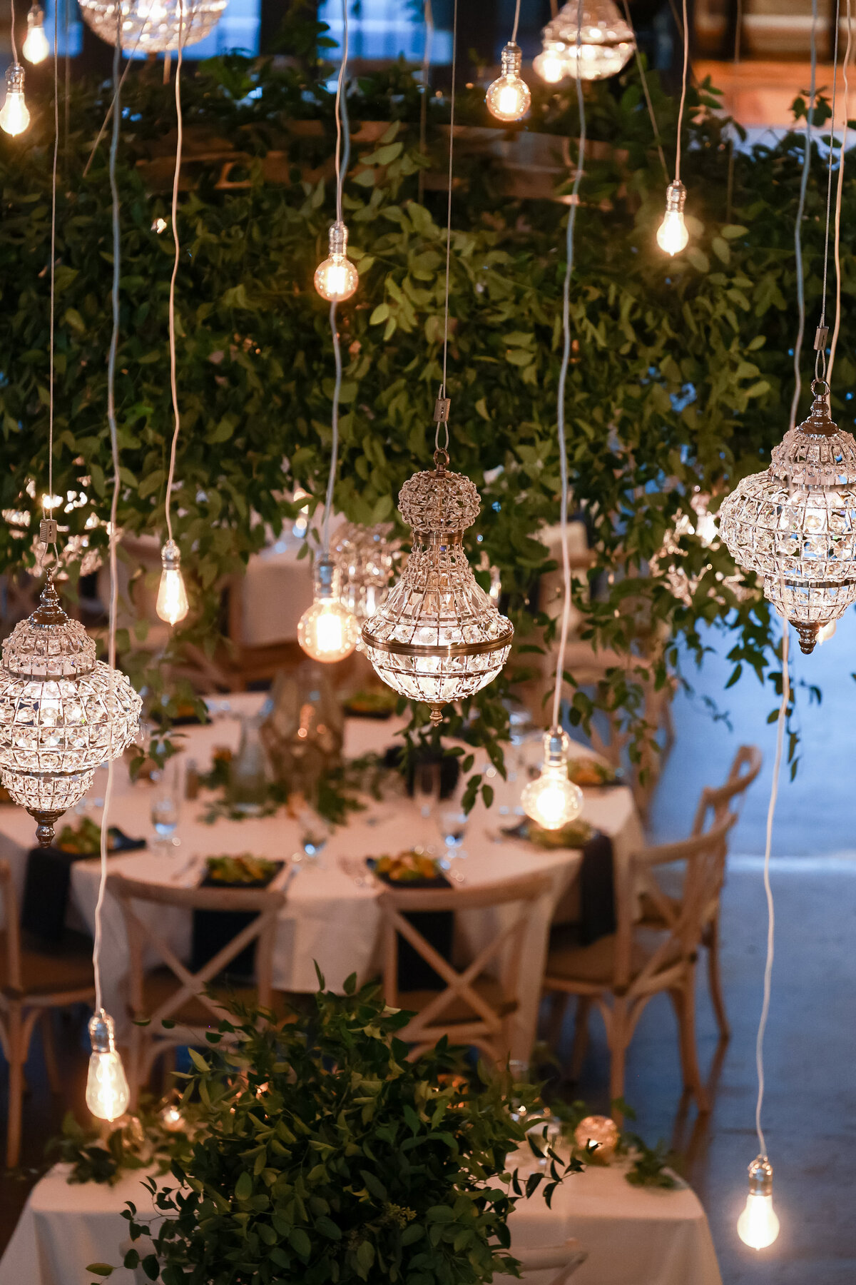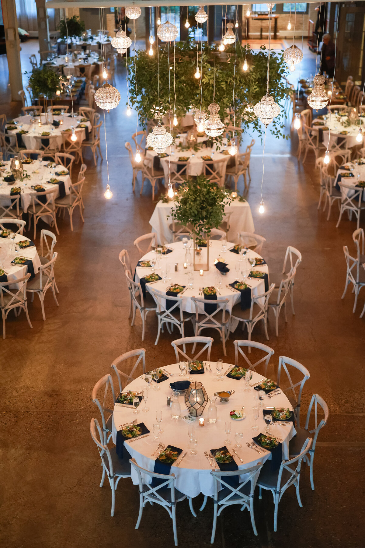 Literally surrounded by their family and friends Brock and Rob said I DO in a stunning ceremony in the round under a custom installation of chandeliers, glowing edison bulbs, and a six foot diameter greenery chandelier. Having a plethora of incredibly talented friends, the couple had a grand piano brought in for the ceremony and the ceremony featured surprise songs and readings from their closest friends. This wedding day at The Machine Shop was the most joyful. I designed the day using the couple's desired inspo- greenery, gold, and a touch of modern geometrics. Every guest at this wedding dressed to the nines, my team said all night it felt like the Met Gala, and their dance moves surely didn't disappoint either. I also may have mentioned to the DJ during cocktail hour that he should slip in a show tune at dinner, and he did...and let's just say it was more than well received and that DJ knows how to read a room...guests were standing on the tables singing Wicked by the end of dinner. Together we're....unlimited.